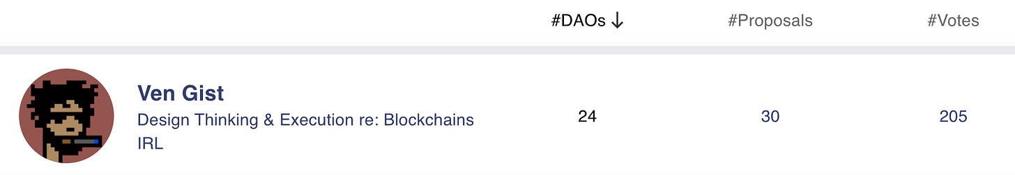 We want to give a shoutout in this project spotlight to Ven Gist, a key member in the DAO ecosystem and currently ranked number #1 when looking at total DAOs participation. The total amount equals 24 and includes DAOs such as MetaCartel, Moloch, and Raid Guild.